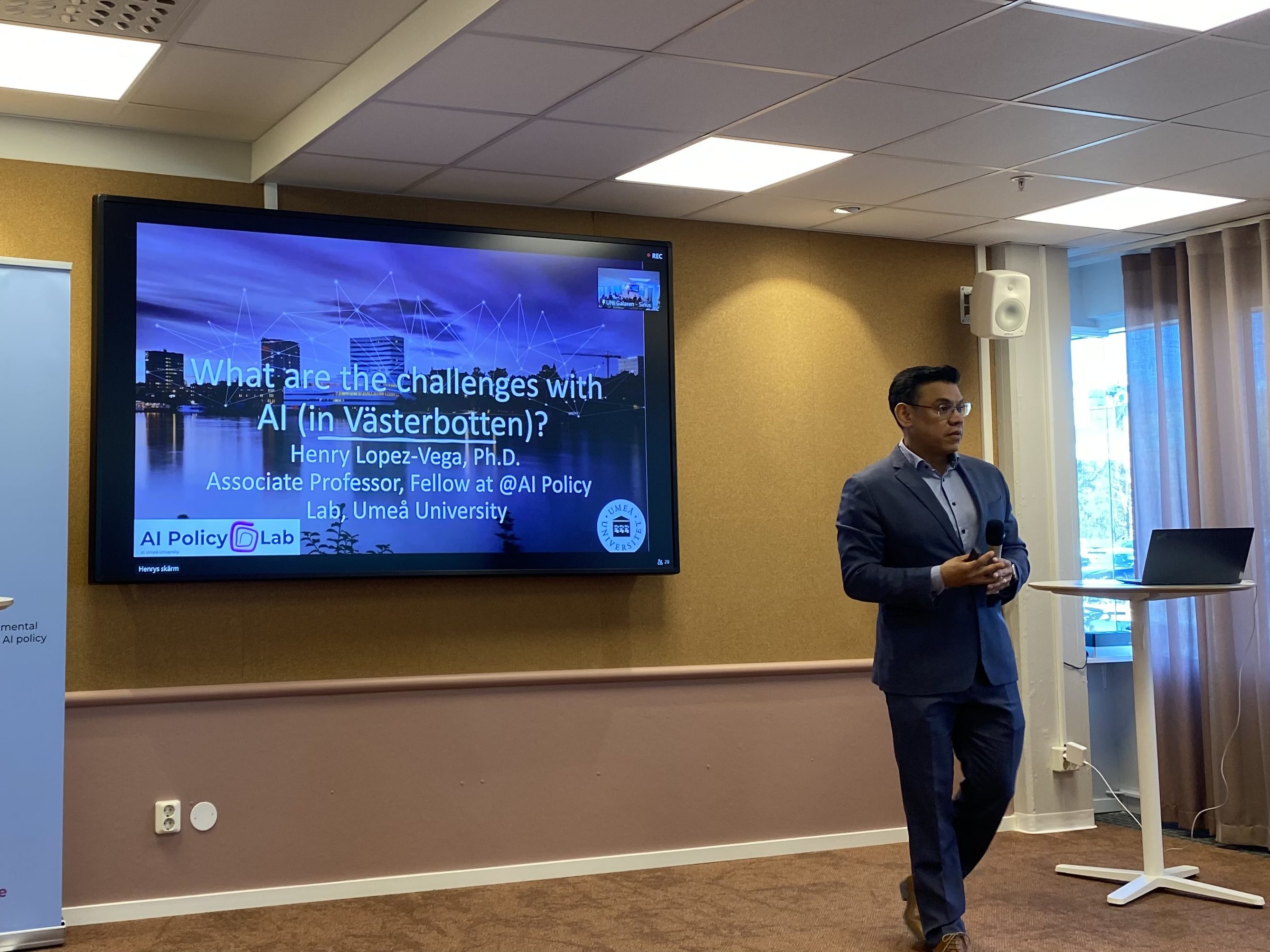 Considering the wide range of public services open to AI adoption, a recurring set of challenges consistently emerges. Whether deploying AI-driven diagnostic tools in healthcare or implementing predictive analytics within smart city infrastructures, public and private sector actors, and community stakeholders face diverse barriers. Henry Lopez-Vega, fellow at the AI Policy Lab, presented on the challenges of AI adoption in the Västerbotten region in his session titled “What are the challenges with AI (in Västerbotten)?”