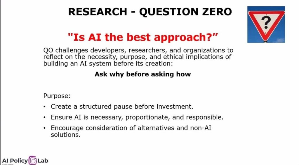 • Should a clear AI clarification step be required before entering Question Zero (“Why do you plan to adopt an AI system?”)?