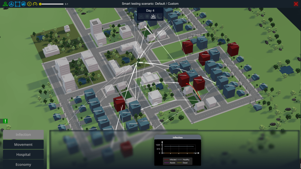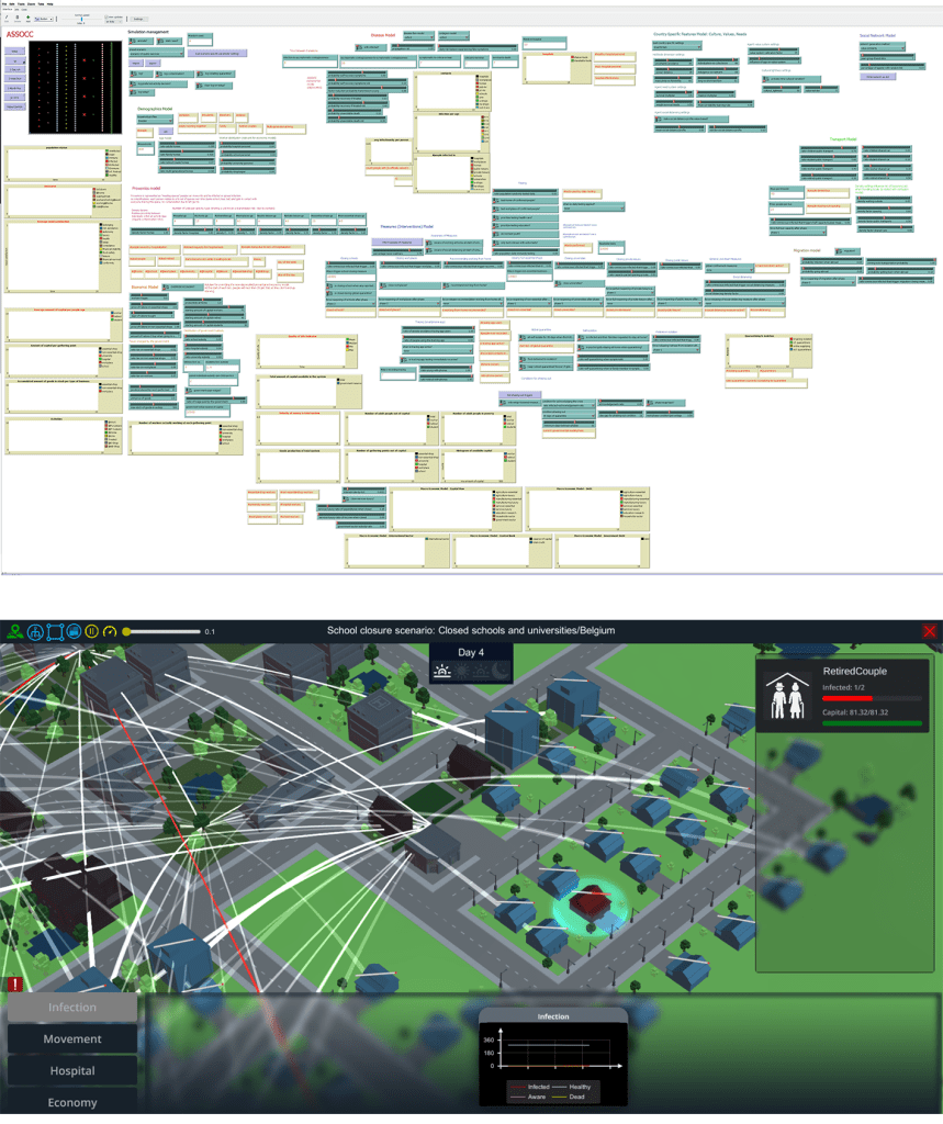 We use a “coronavirus in Simcity” approach to study individual and social reactions to these policies. This is a tool for decision makers to explore different scenarios and their effects. It is not a model to generate predictions.